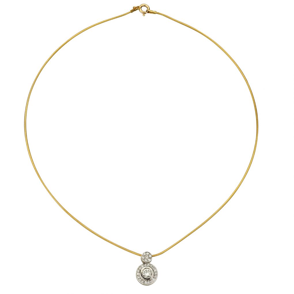 Ladies 14kt white and yellow gold diamond pendant necklace featuring a 0.60 carat round brilliant cut bezel set diamond of (SI-1) in clarity and (I-J) in color; surrounded by (26) round brilliant cut diamonds weighing 0.26 carat total weight. 11mm x 17mm. 16" in length.
