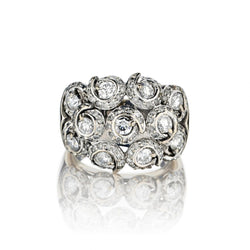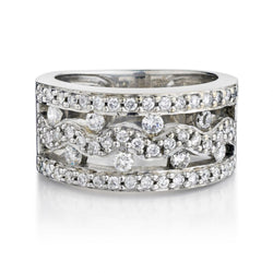 Ladies 18kt white gold wide floral diamond band featuring 1.08 carat total weight of Round Brilliant cut diamonds of (VS-SI) in clarity and (E-F) in color. Weighs 15 grams .Current finger size: 7-3/4. This ring can be resized. 14mm in width.