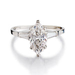 Ladies beautiful platinum engagement ring featuring a 1.20 carat Marquise cut diamond of (VS) in clarity and (F) in color. Flanked between (2) tapered baguette cut diamonds weighing 0.20 carat total weight. Currently a finger size 4 3/4 but can be resized.