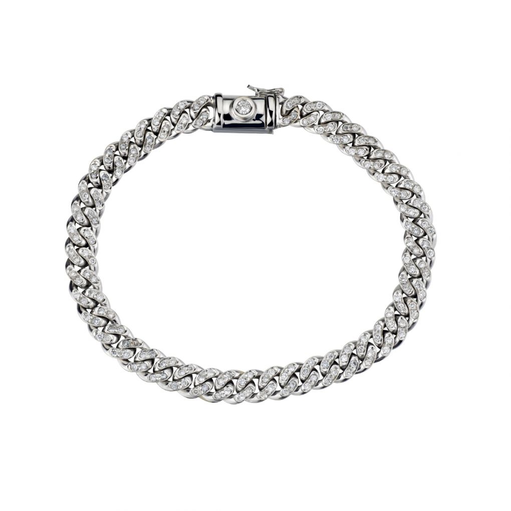 Ladies 18kt white gold diamond curb-link bracelet enhanced with pave-set Round Brilliant cut diamonds weighing 1.20 carat total weight of (VS) in clarity and (G) in color. 7" in length. Weighs 19 grams.