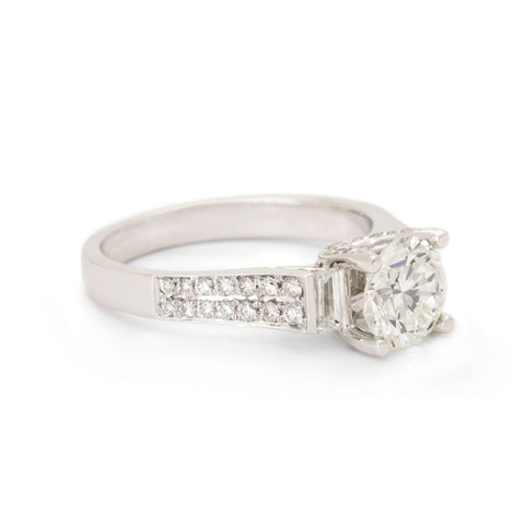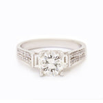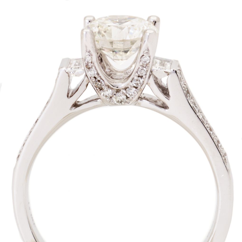 Ladies 18kt white gold diamond ring featuring a Round Brilliant cut diamond weighing 1.22 carat weight of (SI-1) in clarity and (G) in color. The ring is flanked by (2) flat rectangular baguette cut diamonds; along with a