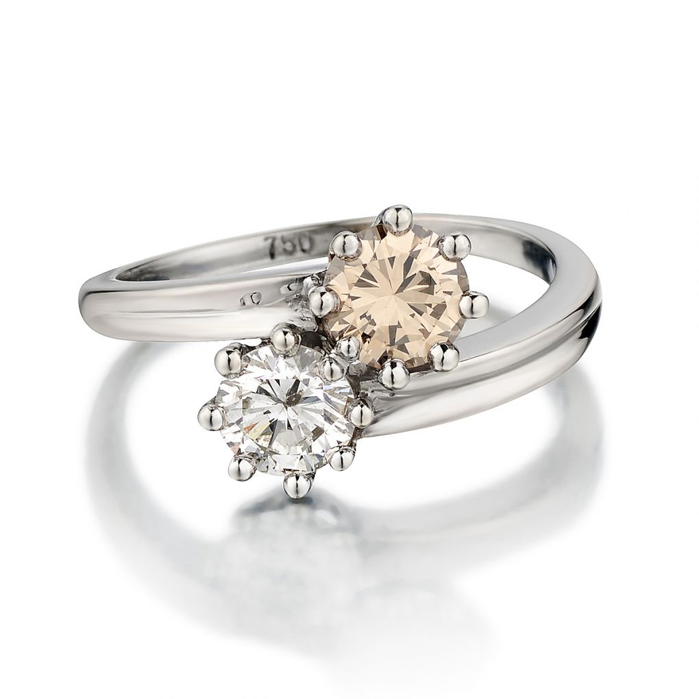 Ladies 18kt white gold two-stone diamond ring featuring 2 x 1.50 carat total weight of Round Brilliant cut diamonds weighing 0.75 carat each of (VS-I-1) in clarity and (H, Brown) in color. Currently a finger size 8 but can be resized.