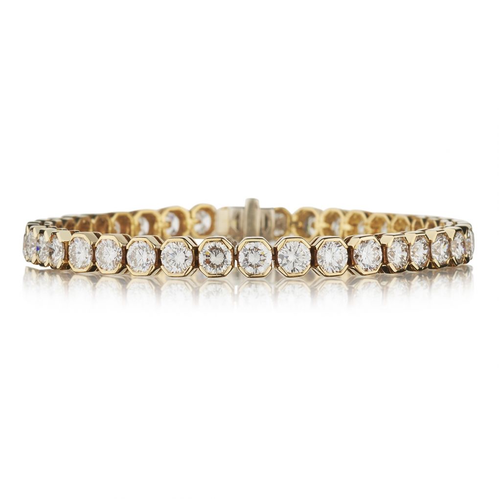 Ladies octagonal bezel-set 18KT yellow gold diamond tennis bracelet featuring (38) Round Brilliant-cut diamonds weighing 13.00 carat total weight of (VS) in clarity and (G) in color. 7 1/4" in length.