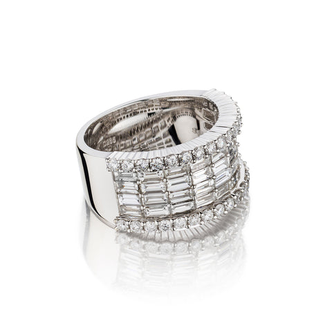 14kt white gold diamond ring featuring 2.85 total carat weight of Baguette and Brilliant cut diamonds. The Baguettes are set length wise in the centre and are framed by 2 rows of Brilliant cut diamonds. Measuring 11mm (W). Current finger size: 7-1/4. This ring can be resized.