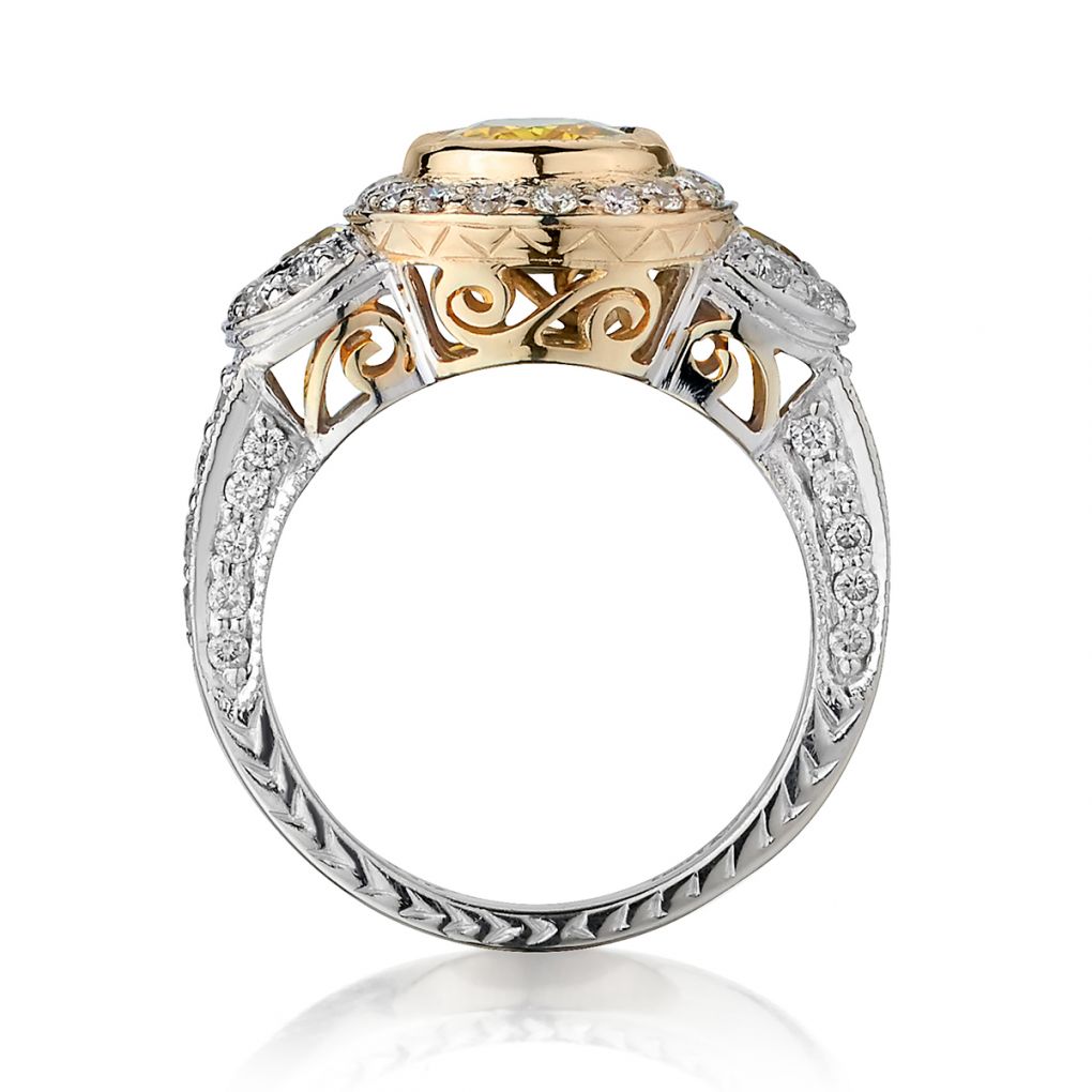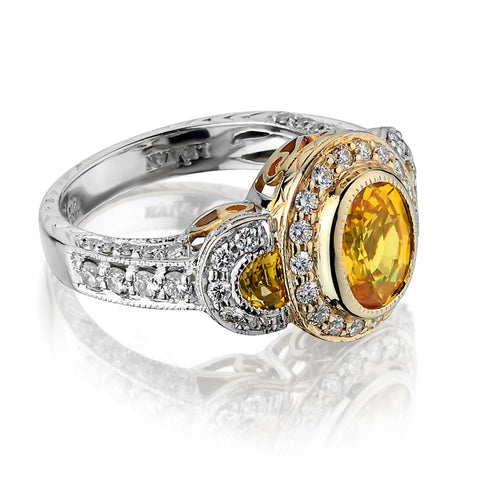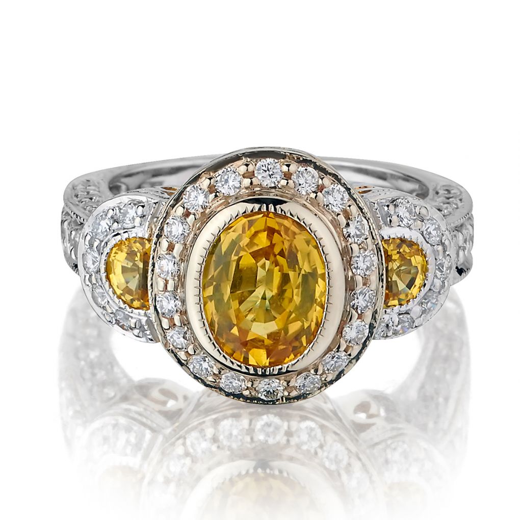 • 14KT White Gold Yellow Sapphire And Diamond Halo-Set Three Stone Ring