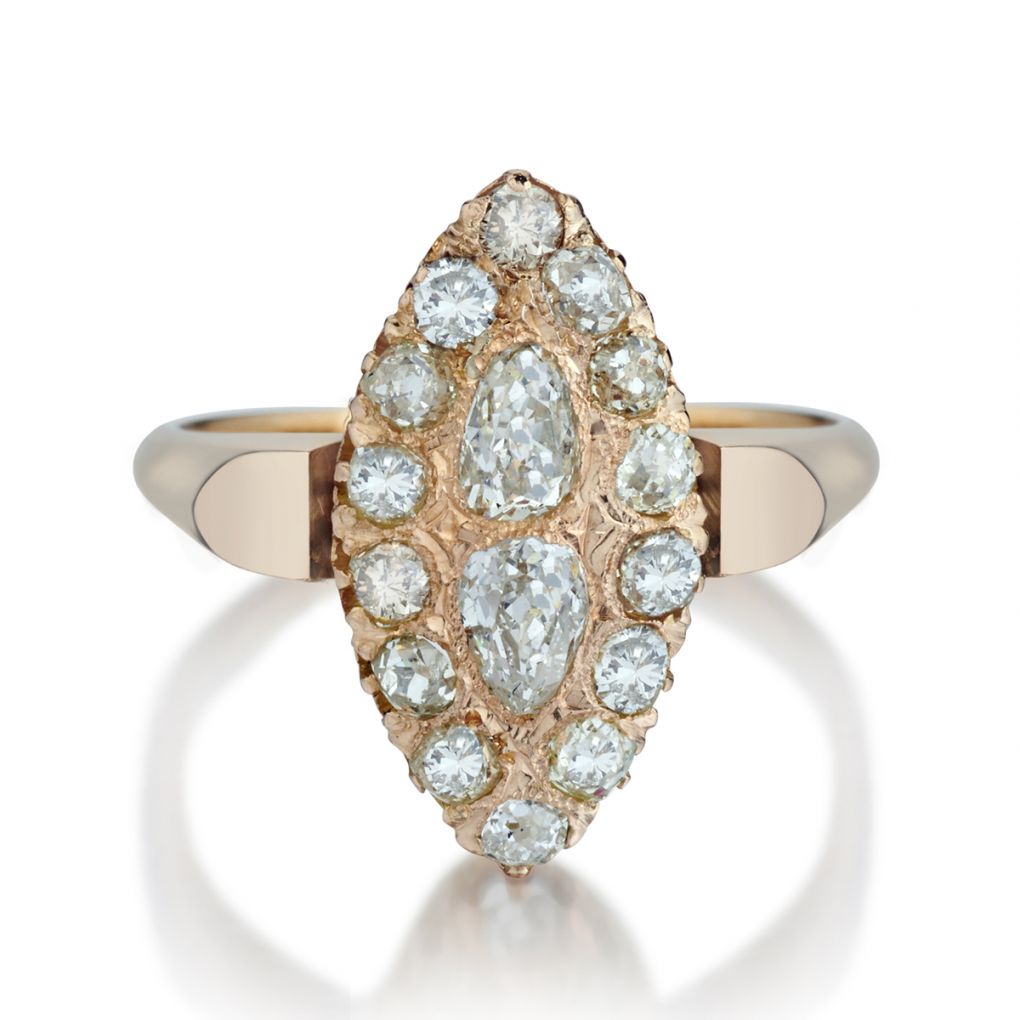 18KT Rose Gold Old-Mine Cut Diamond Navette Victorian Ring