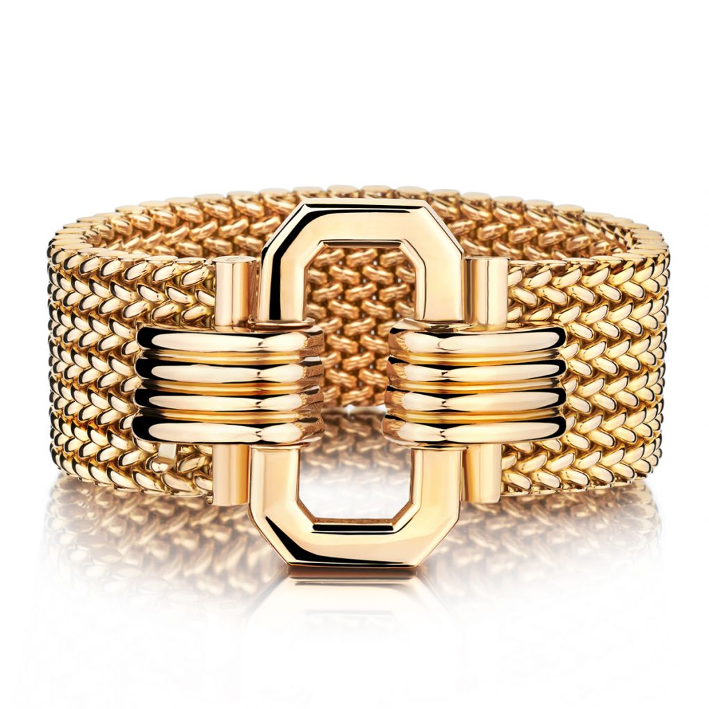Ladies 18kt rose gold vintage bangle/bracelet. 93 grams in weight. The heavy mesh bracelet fastens with a bold 3 dimensional buckle at the centre. 8" in length. 1" width. Circa 1940's.