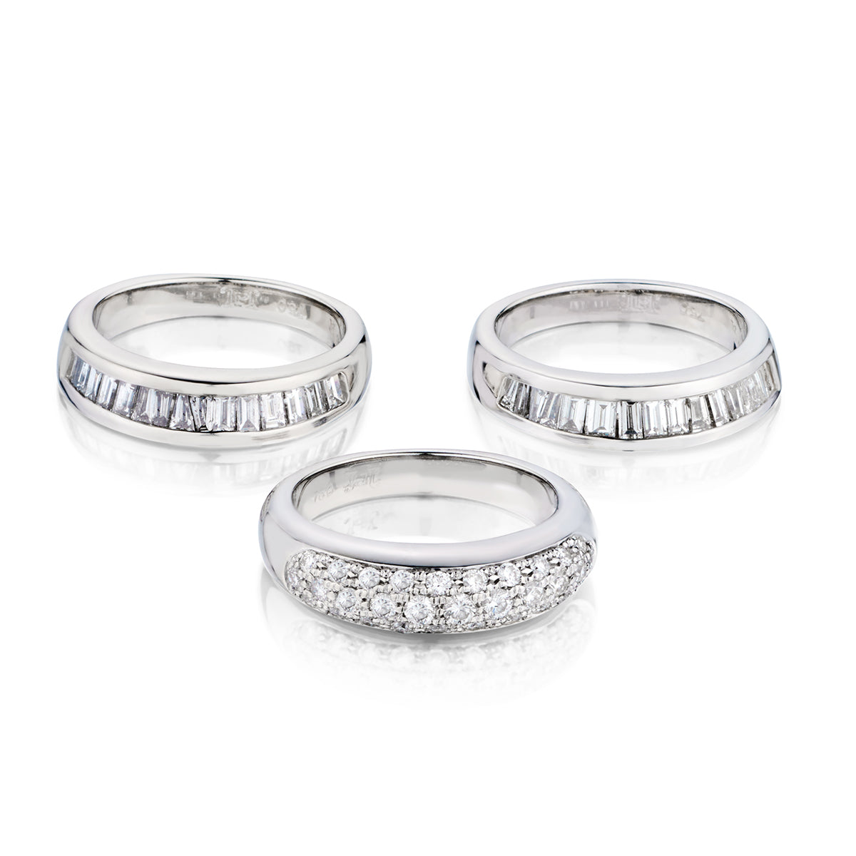 18kt white gold diamond stackable bands. This ring features 60 x 3.00 total carat weight of Baguette and Brilliant cut diamonds of (VS-SI) in clarity and (G-H) in colour. 2 bands feature baguette cut diamonds and one band features Brilliant cut diamonds in a pave' setting. Rings can be worn individually or stacked. Your preference . Versatile. Weight: 21 grams. Current finger size: 7-1/2. These rings can be resized.