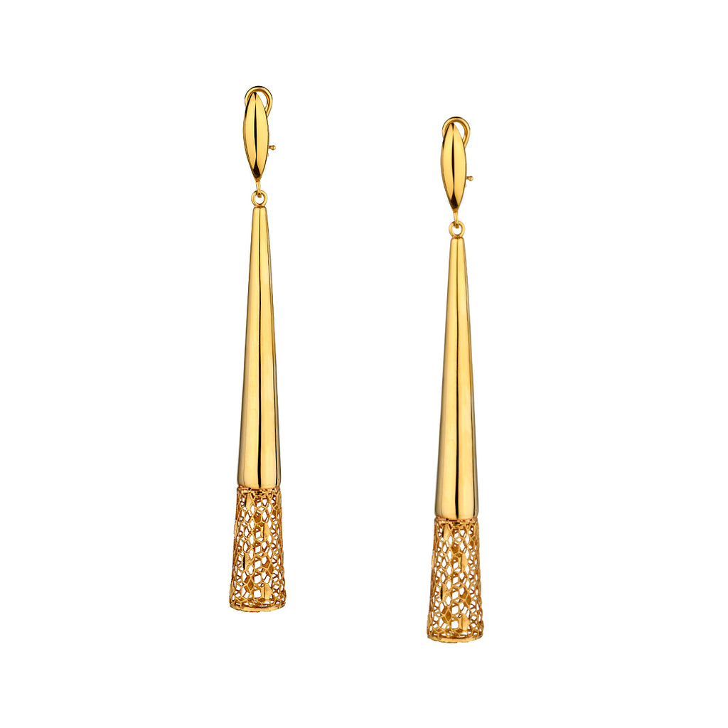 Ladies 18kt yellow gold drop pendant earrings. These earring feature a drop measuring: 3-1/2" (L). Weight: 9 grams.