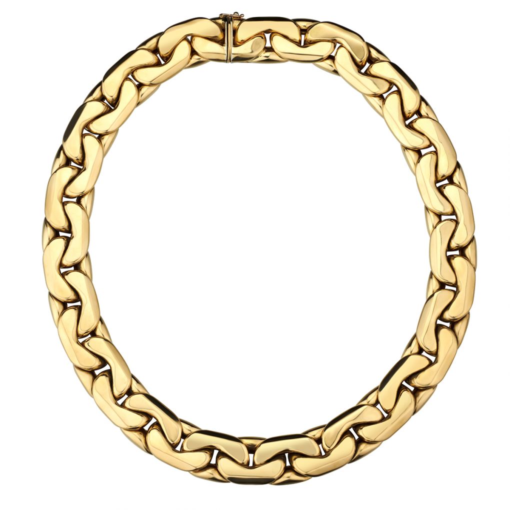 Ladies 18kt yellow gold choker necklace. Made in Italy. 17" in length. 16mm in width. 122 grams in weight.