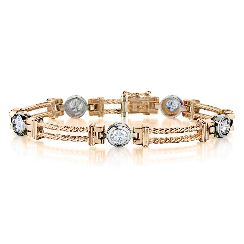 Ladies 14kt yellow and white gold diamond bracelet featuring 5 x 3.25 total carat weight of Brilliant cut diamonds of (SI-2) in clarity and (J) in colour. These diamonds are bezel set in 14kt white gold. Length: 7 inches. Weight: 26.62 grams.