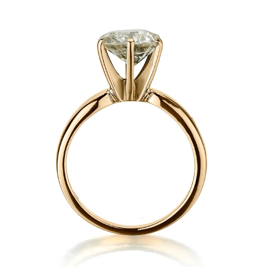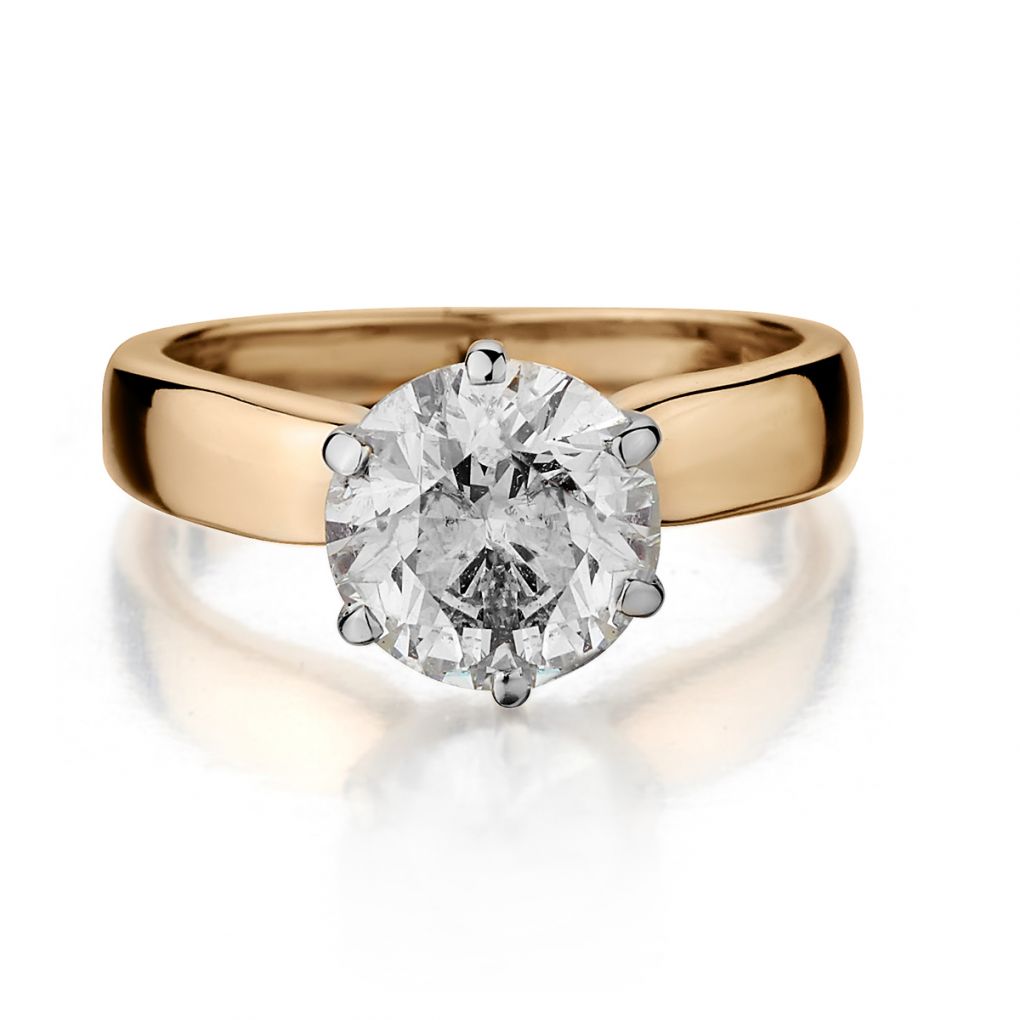 Ladies 14kt yellow gold solitaire ring featuring a Brilliant cut diamond weighing 2.30ct, carat weight of (I-2) in clarity (enhanced) and (J-K) in colour. 6 claw head. Finger size 6. This ring can be resized.