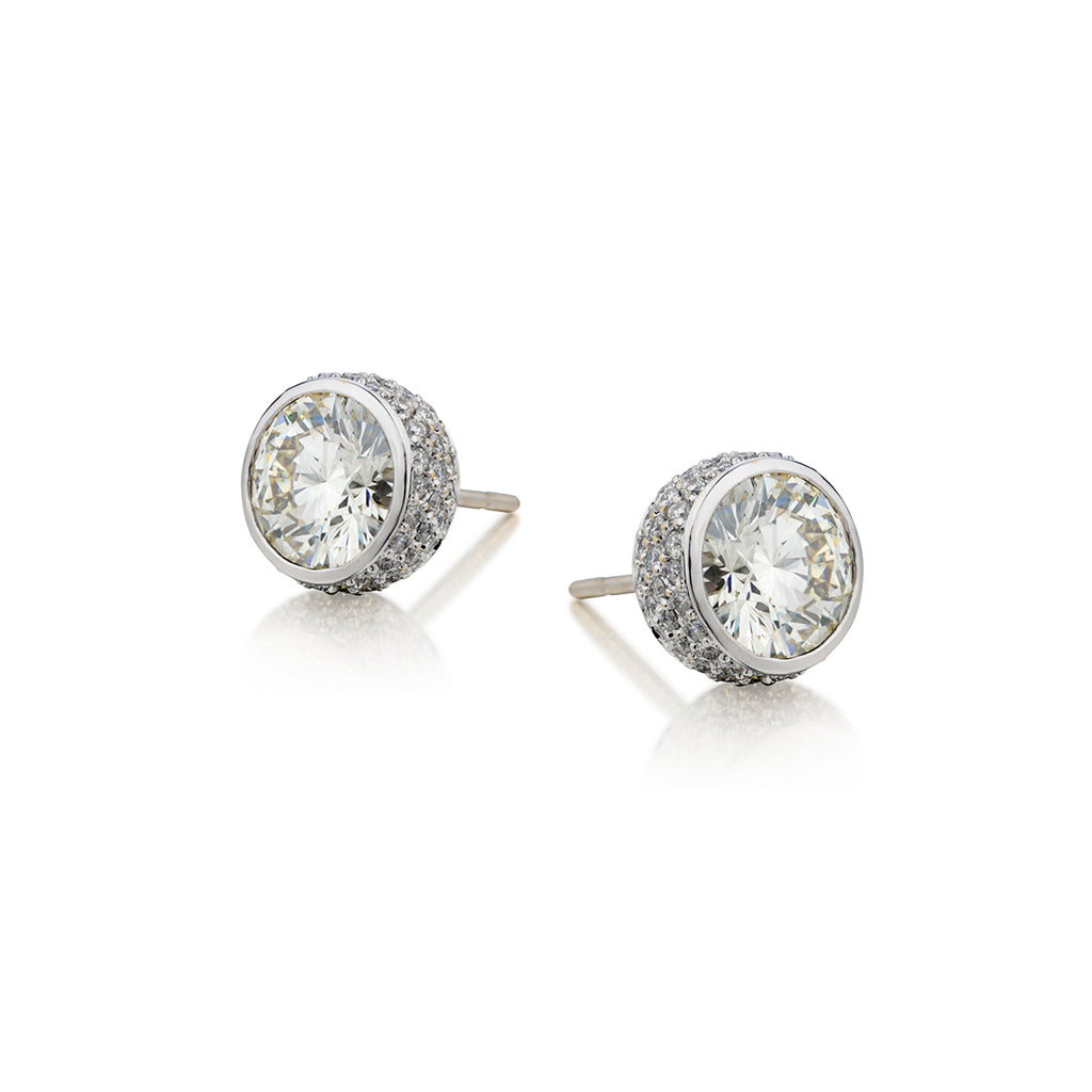 Ladies 18kt white gold diamond stud earrings featuring 2 x 6.15 carat total weight of Round Brilliant cut diamond studs in a bezel-setting of (VS) in clarity and (K-L) in color. Further surrounded by 2.00 carat total weight of Round Brilliant cut pave-set diamonds. Post and butterfly backing.
