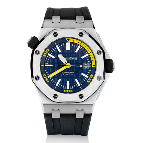 Mens stainless steel Audemars Piguet Royal Oak Offshore Divers watch.Automatic movement. Caliber 3120. Power reserve :60 hr. 42mm case size. Water resistant to 300 metres (1,000.00 feet).Date. Sapphire crystal. Blue dial. Blue rubber band with original Audemars Piguet tang buckle.Extra yellow rubber band.Circa 2020.Ref:15710 ST