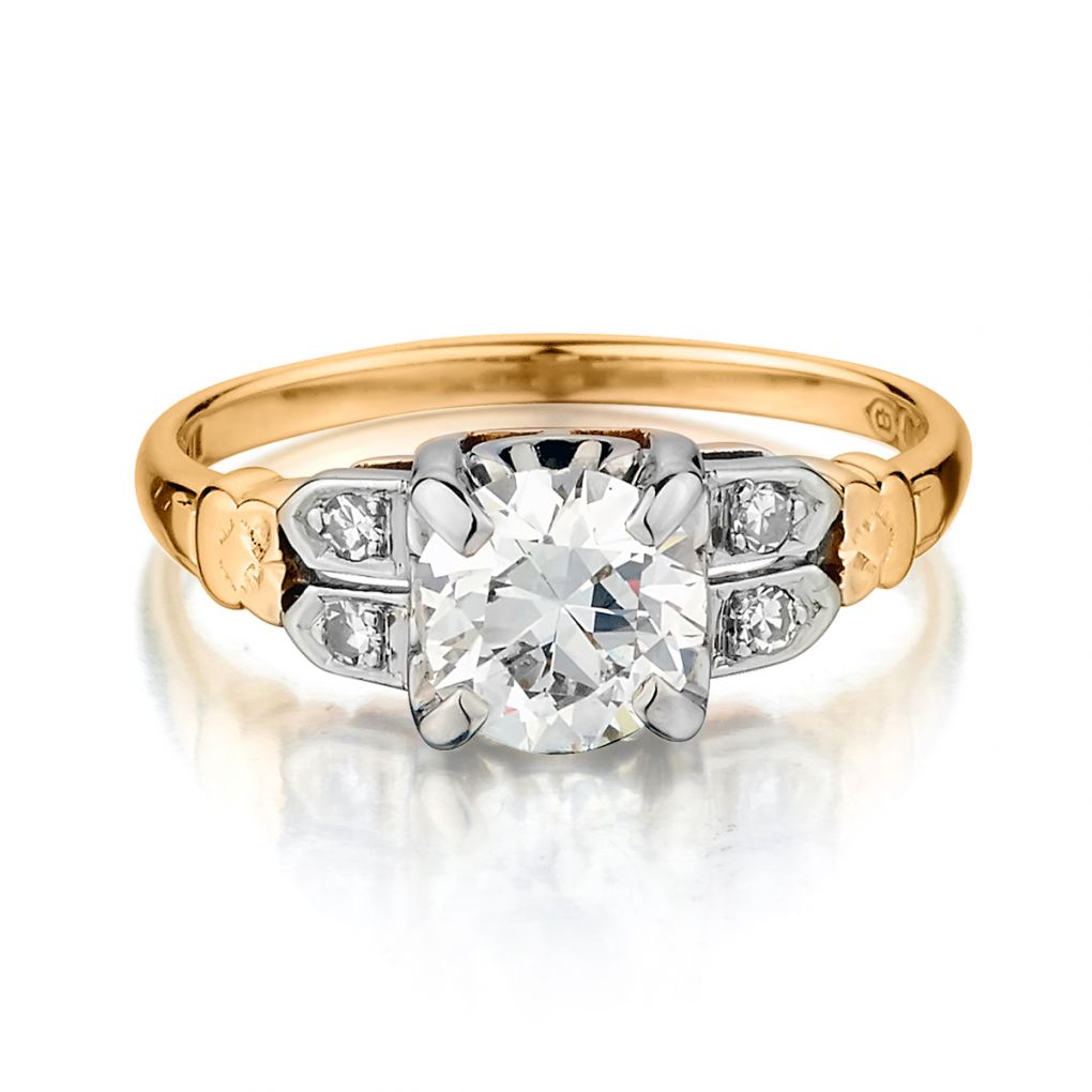 Ladies vintage diamond ring made by Birks in 14kt white and yellow gold featuring a European cut diamond weighing 1.05 carat weight of (SI) in clarity and (I-J) in colour. Also containing 4 x 0.06 total carat weight of sidetones. Current finger size 6-3/4. This ring can be resized.
