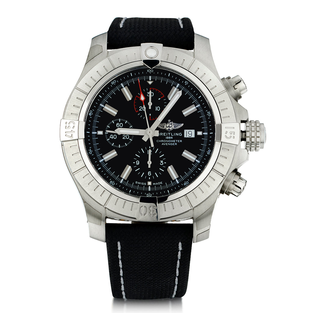 Mens Breitling Aeromarine Super Avenger in stainless steel. Black canvas strap with Breitling deployant buckle. Black dial with luminous baton hour markers and hands. Automatic movement. Chronograph function. Measuring:48mm case size. 17.75 thick. Sapphire non scratch crystal. Circa 2022. Reference number: A13375.