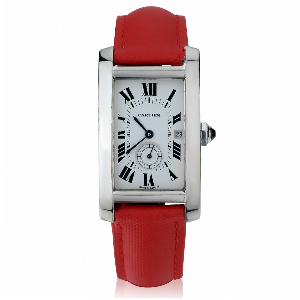 Cartier Tank Américaine in 18kt white gold. Quartz movement.Calibre 012. Silver dial with Roman numerals. Date and small seconds hand. 31.5mm x 24 mm case size. Sapphire crystal. Cartier band with deployment buckle. Reference: 1726. Circa 2000.