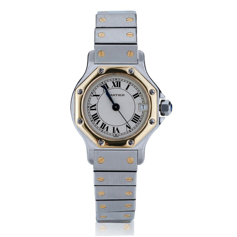 Ladies Cartier Santos in steel and 18kt yellow gold. Integrated steel and 18kt yellow gold bracelet. Octagonal in shape. Quartz movement.Roman numerals.25 mm case size.