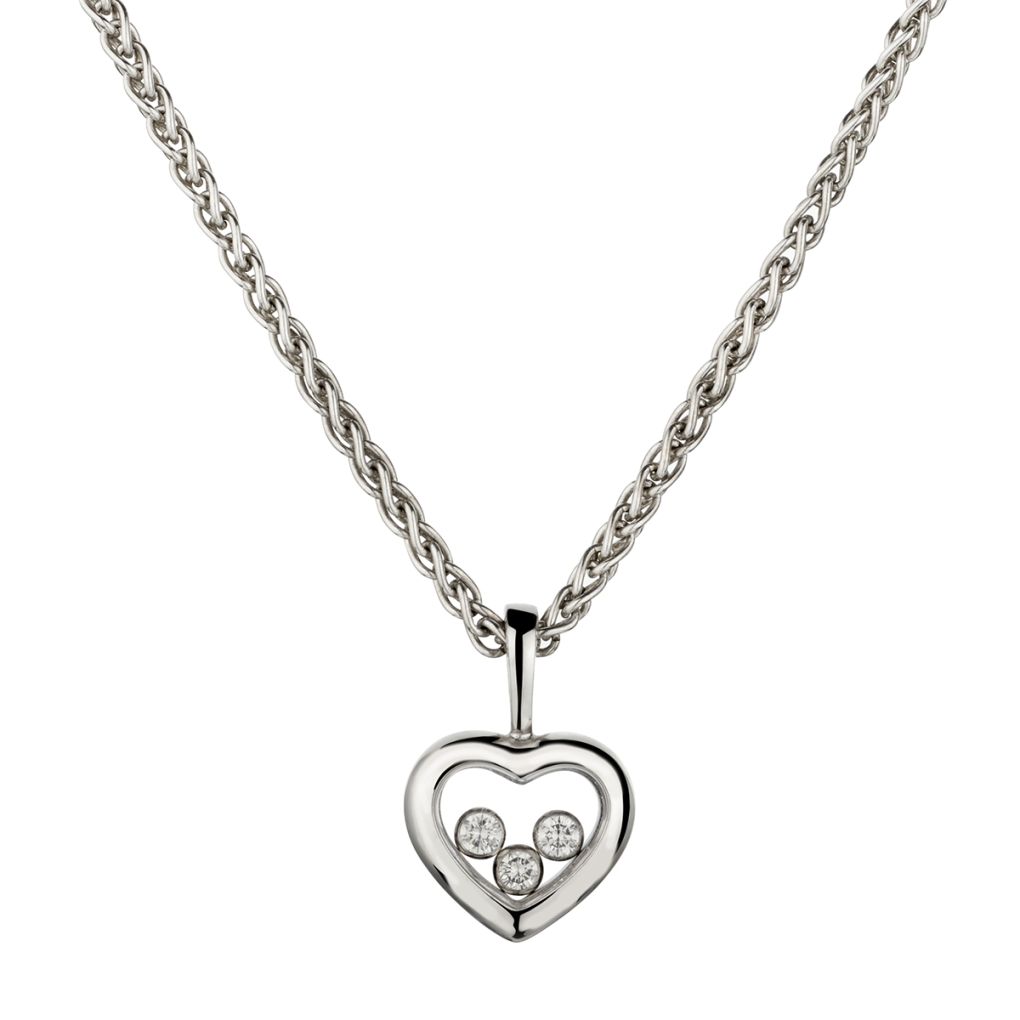 Chopard Small Happy Sport Diamond Heart pendant featuring a heart shaped pendant in 18kt white gold and set with an inlay of glass which reveals 3 Brilliant cut diamonds weighing 0.15 total carat weight. This pendant is suspended from an 18kt white gold Chopard chain measuring 17" in length. Heart with bale measures: 17mm (L) x 12mm (W).