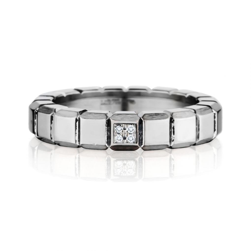 Chopard "Ice Cube Collection " in 18kt white gold. Meticulously crafted squares. One square is set with 4 Brilliant cut diamonds. High fashion can be worn with stackable. Width 4mm.Weight: 8 grams.Current finger size: 54 (6-1/2). Made in Switzerland.