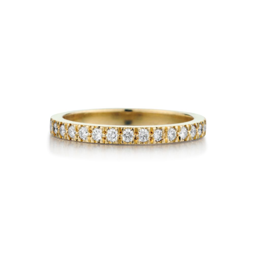 Tiffany & Co Diamond 18kt Yellow Gold diamond band featuring 16 x 0.20 total carat weight of Brilliant cut diamonds of (VS) in clarity and (F) in colour. 2mm diameter. Half way around. Current finger size: 4-1/2 This ring can be resized.
