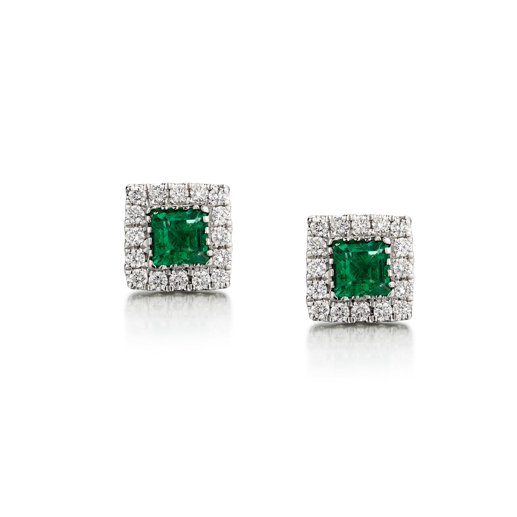 Ladies 18kt white gold Diamond and Emerald earrings. These earrings consist of 2 x 0.53 square emeralds surrounded by a halo of 32 x 0.24 total carat weight of Brilliant cut diamonds. Post and stud closure.