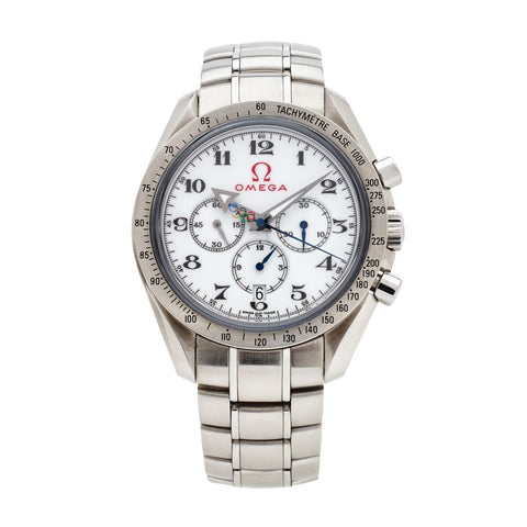 Gent's stainless steel Omega Speedmaster Specialities Olympic Collection wristwatch. Integrated brushed and polished stainless steel bracelet. Bold white dial with black Arabic numerals; luminous hands; three sub-dials; small seconds counter, 30-minute recorder and 12-hour recorder; Central chronograph hand with Olympic Rings counterweight; date aperture at the 6 o'clock position. Fixed stainless steel bezel with tachymeter scale function. 42mm case diameter. Sapphire crystal. Automatic Co-Axial movement; calibre 3313. Originally purchased in 2014. Reference #: 32110425004001.