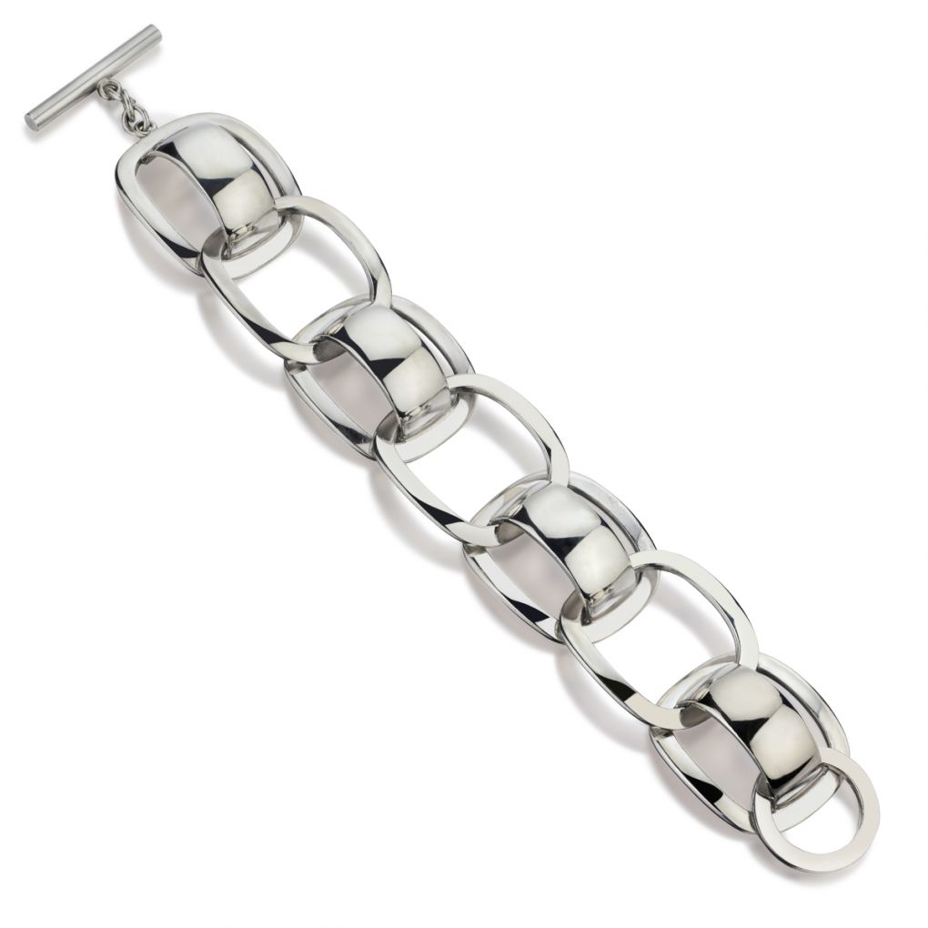 Ladies sterling silver Georg Jensen vintage bracelet. Designed by Ibe Dahlquist with 7 rectangular arched and cushion shaped links. Denmark. Toggle clasp. 1 1 /4" x 8". Circa 1967.