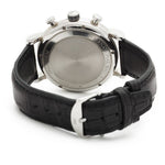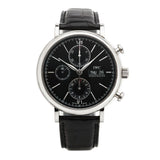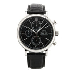 Gent's stainless steel IWC Portofino Day/Date Chronograph watch featured on a black leather strap. Automatic movement. Black dial with Applied Silver Index Hour Markers; date-day window at 3 o'clock position. 41mm case diameter. Sapphire crystal. Reference #: 3783.