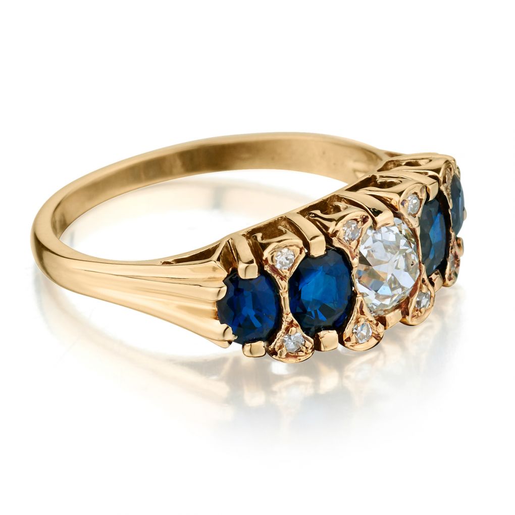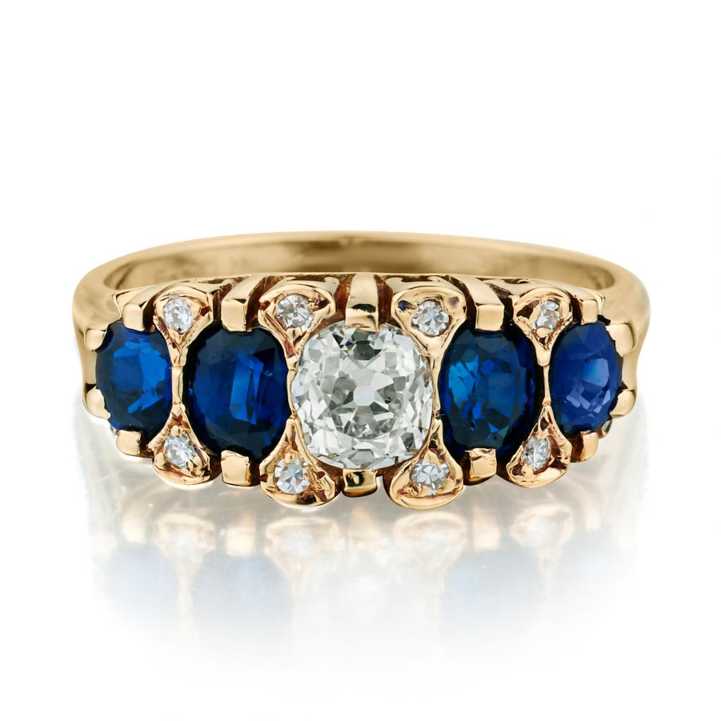 Ladies Edwardian era 14kt yellow gold Blue Sapphire and Diamond ring. This ring features a Mine cut diamond weighing 0.65 carat weight of (VS) in clarity and (J) in colour. Also containing 8 x 0.08 total carat weight of single cut diamonds. Also featuring 4 x 0.50 Oval cut Blue Sapphires. Current finger size 7-1/2. This ring can be resized.