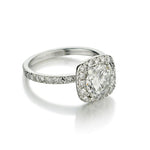 Ladies 14kt white gold diamond ring featuring a brilliant cut diamond weighing 1.50 carat weight of (VS) in clarity and (K) in colour. This diamond is surrounded by a halo of Brilliant cut diamonds of (SI) in clarity and (G-H) in colour. Pave set. Current finger size 6. This ring can be resized.