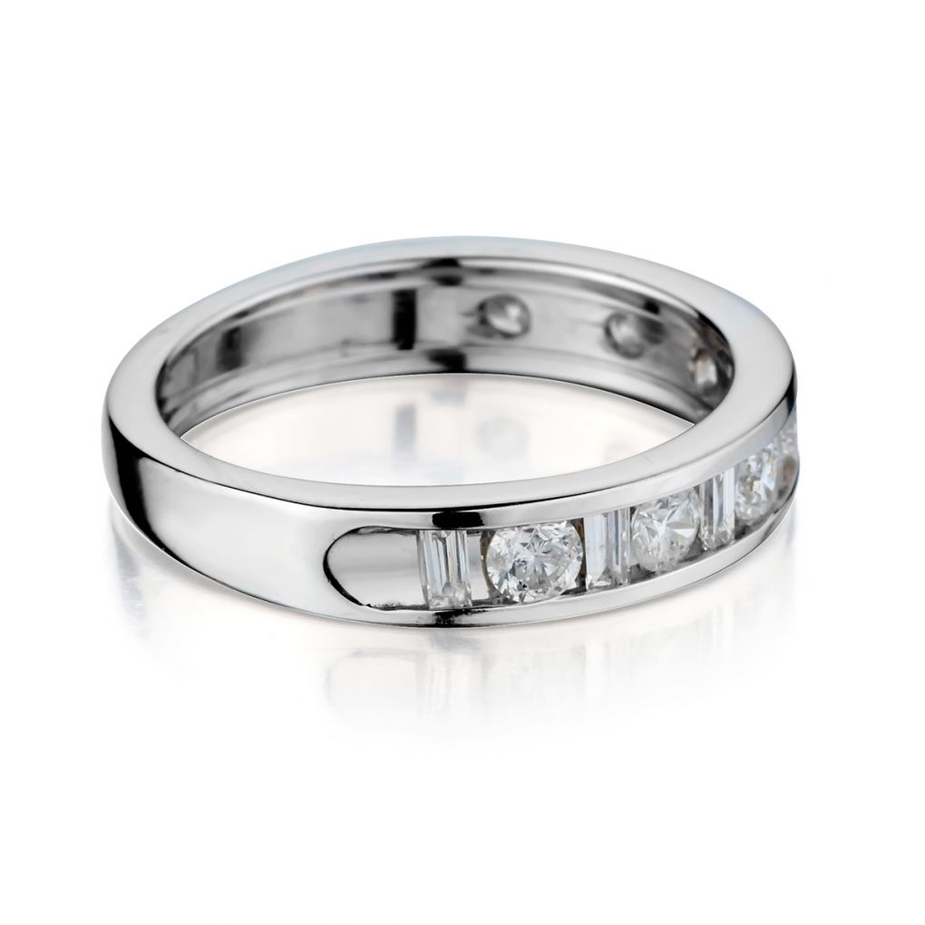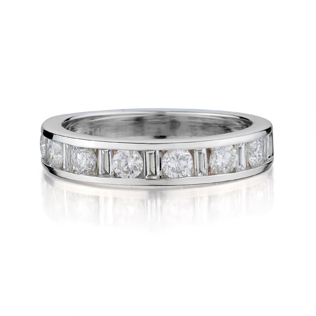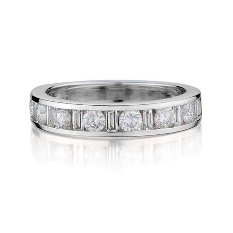 Ladies 14kt white gold diamond band featuring 1.00 total carat weight of alternating Brilliant cut and Baguette cut diamonds of (I-1) in clarity and (H) in colour. Current size 7. Width:4mm.