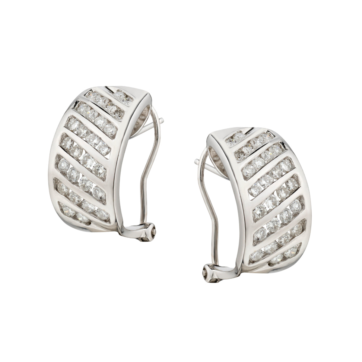 Ladies 14kt white gold diamond huggies earrings. These earrings feature 1.00 total carat weight of Brilliant cut diamonds. Channel setting. Post and clip back. Measuring: 17mm (L) x 9mm (W). Weight: 4.8 grams.