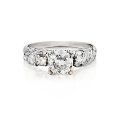 Ladies 14kt white gold diamond ring featuring a European cut diamond weighing 1.47 carat weight of (I-1) in clarity and (H-I) in color. Also featuring 10 x 0.26 carat total weight of Brilliant cut diamonds. 6 claw setting.The current size of this ring is a size 6. This ring can be resized.