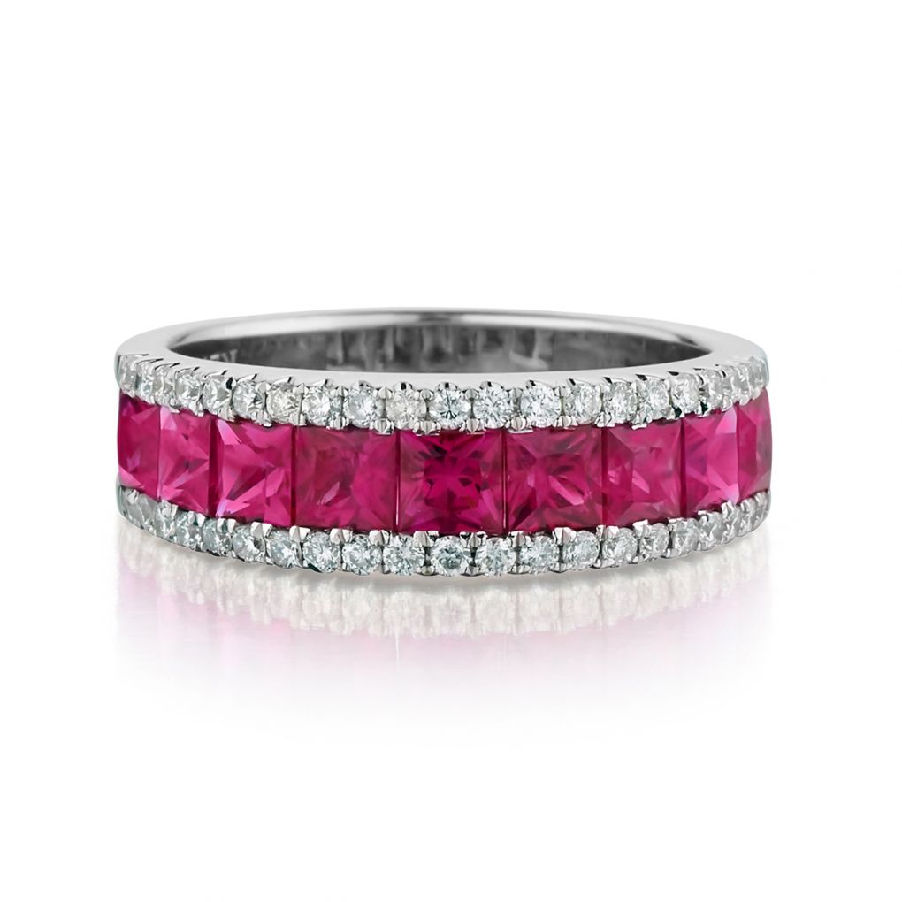 Ladies 18kt white gold Ruby and Diamond ring featuring 9 x 2.12 total carat weight of Square cut rubies invisible set. Also featuring 42 x 0.36 total carat weight of Brilliant cut diamonds. Half way around. Current size 6-1/2. This ring can be resized.