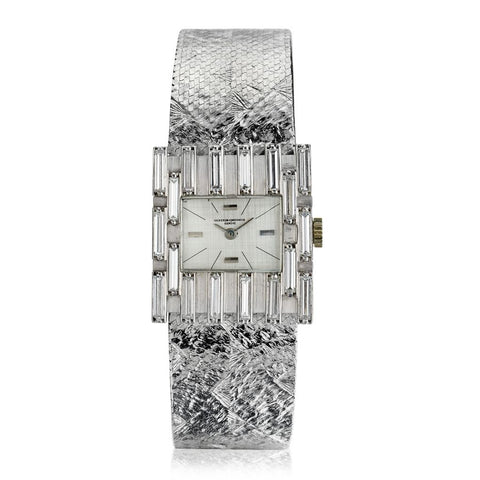 Ladies 18kt white gold Vacheron Constantin dress watch. Factory baguette diamond bezel.Integrated 18kt white gold bracelet. 7 inches in length.Silver dial.58 grams in weight. 24mm x 21mm case diameter.Manual winding movement. 20 Jewels. All Original Factory done. Circa 1960's