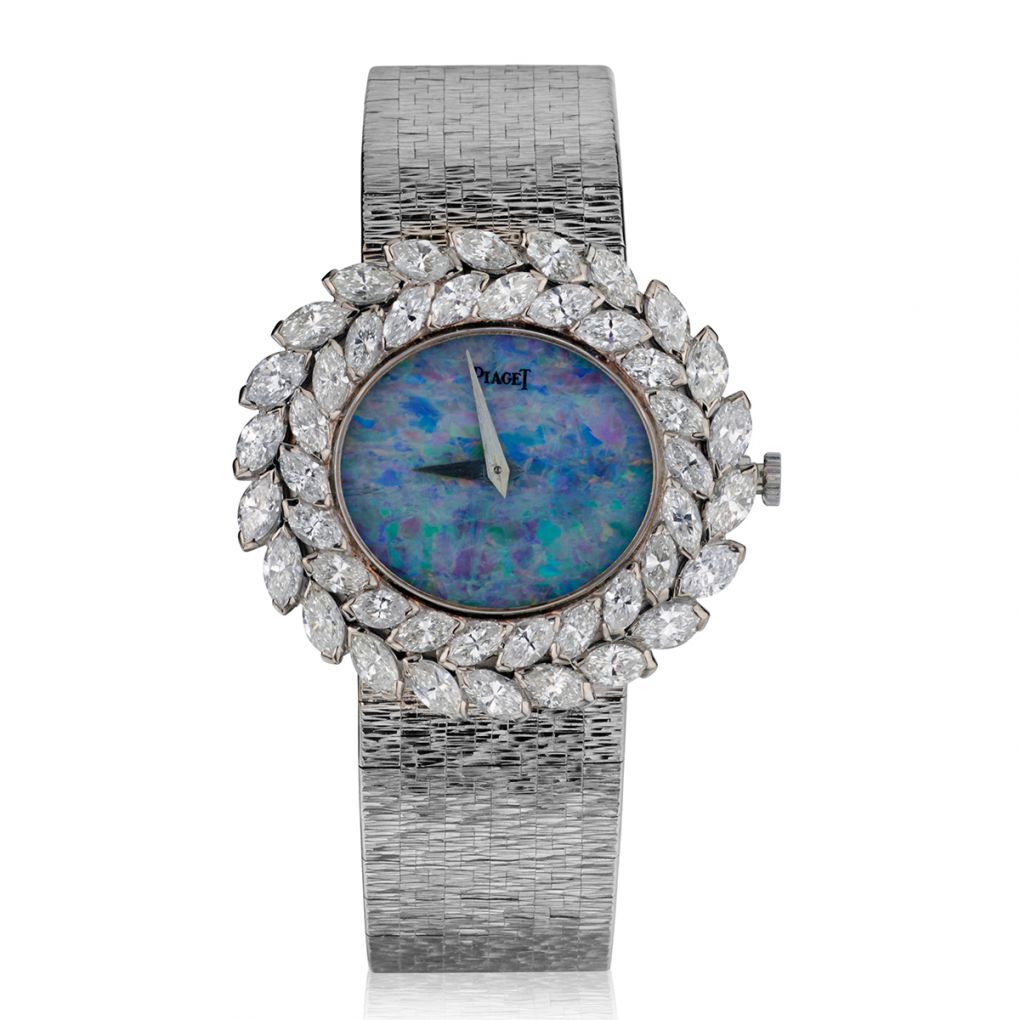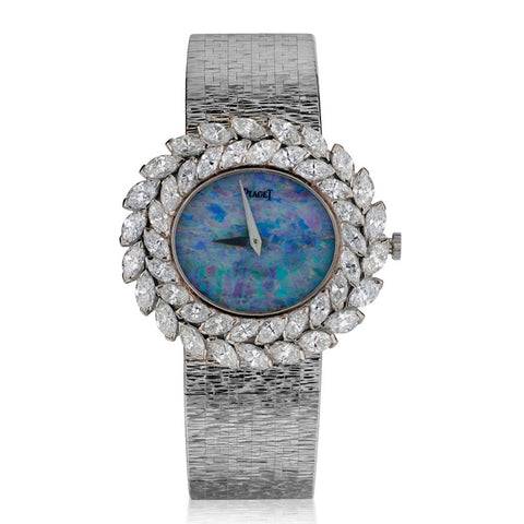 Ladies 18kt white gold and diamond Piaget dress watch with integrated 18kt bracelet. Magnificent Opal dial. 29mm (L) x33mm (W) case measurements. Featuring 4.70 total carat weight of Marquise cut diamonds of (VS) in clarity and (F) in color.6.5 inches in length (extra links available if required).72 grams in weight. Manual wind.