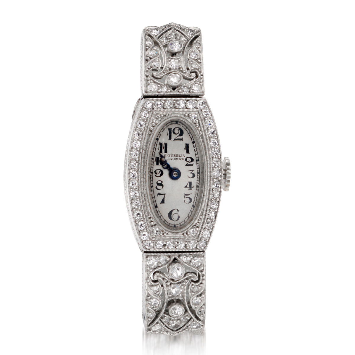 Ladies Vintage Platinum Gubelin Lucern Diamond dress watch. Oval dial. Arabic numerals. Measuring: 48mm x15mm. Manual winding. Beautiful filigree. Featuring a beige cotton bracelet. Circa 1890. Not readily replaceable.