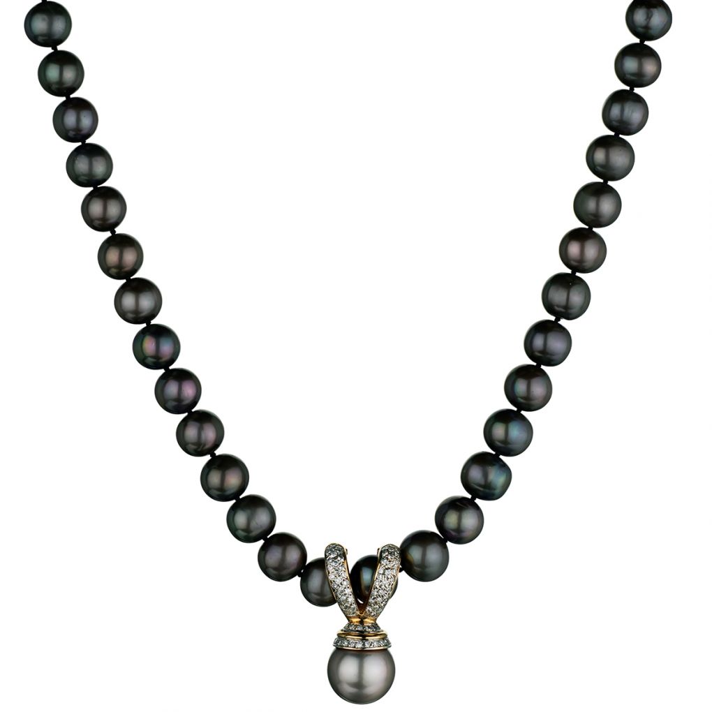 Ladies Tahitian Pearl strand measuring 9.5mm-10mm in size. Diamond ball clasp as closure. Enhanced by a diamond and 14mm Tahitian pearl with diamonds . 17 inches in length. Nice lustre. Pearl strand can be worn alone as enhancer can be removed.