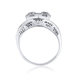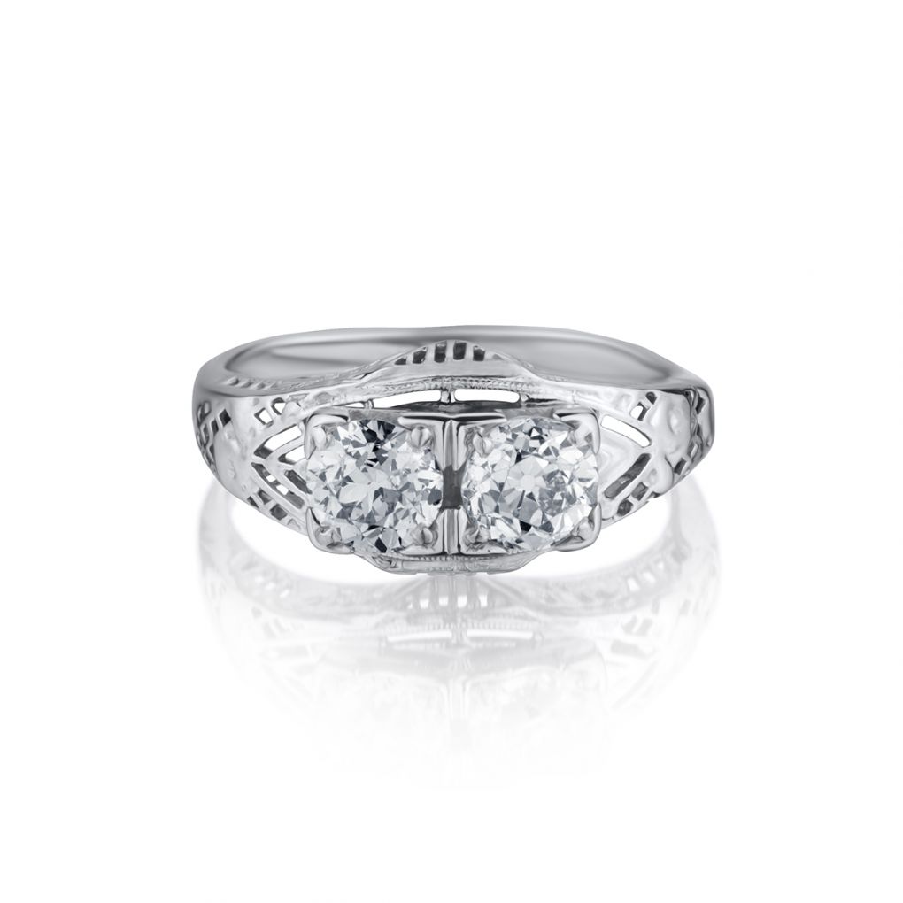 Ladies vintage 18kt white gold diamond ring featuring 2 x 1.20 total carat weight of European cut diamonds of (SI) in clarity and (J-K) in colour. Beautiful filigree detailing. Current finger size: 5-1/2. This ring can be resized.