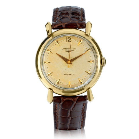 Longines Wittnauer wrist watch. 10kt Gold filled. Automatic movement. Brown leather band with tang. 35mm case size. Plexiglass crystal.17 Jewels.