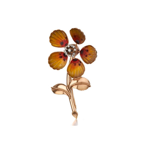 Ladies Mid-Century 18kt rose gold large floral brooch featuring enamel and diamonds. 70mm (l) x 38mm (w). 17 grams in weight. Vibrant yellow and red enamel.