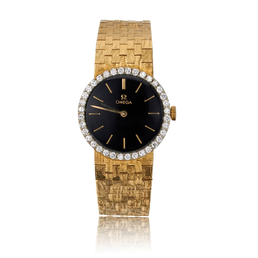 Ladies 18kt yellow gold Omega watch with an integrated 18kt yellow gold bracelet. Black dial with a diamond bezel. Manual winding movement. 24.5mm case diameter. Acrylic crystal. 44.9 grams in weight. Bracelet length is 6 1/2". Circa 1960's.