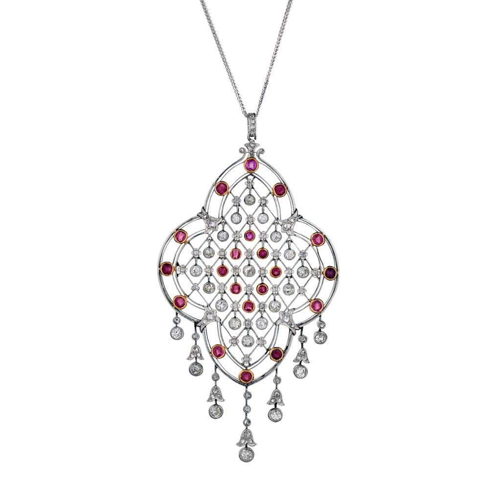 Platinum Vintage "Marrakesh" Design Rose Cut Diamond and Ruby Pendant. 4.50 tw