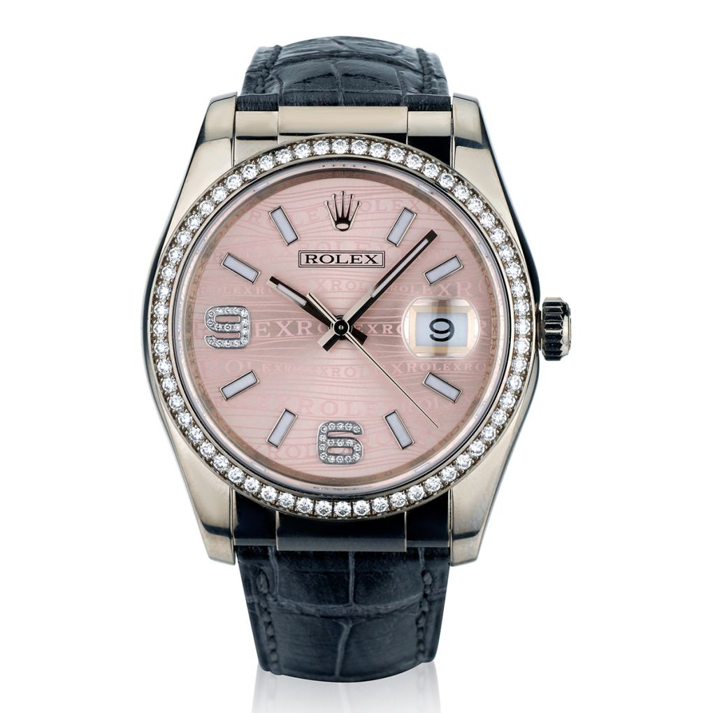 Rolex Datejust 36mm in 18kt white gold wristwatch . Grey crocodile skin band with 18kt Rolex deployant buckle. Pink wave dial with 2 Arabic numerals with diamonds . 18kt diamond bezel set with 32 Brilliant cut diamonds (Factory). Date. Automatic movement. Sapphire crystal.Caliber 3135. Water resistant:10 ATM. Circa 2019. Reference #116189.