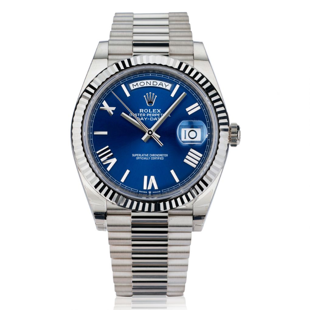 Rolex Day-Date in 18kt white gold. Integrated 18kt white gold bracelet with fold over clasp. Fluted 18kt white gold bezel. Blue dial with Roman numerals. Day-Date. Automatic movement. Caliber: 3255. Power reserve:70 hrs. Jewels:31.Sapphire crystal . Purchased Dec 2021. Unworn. Stickers.