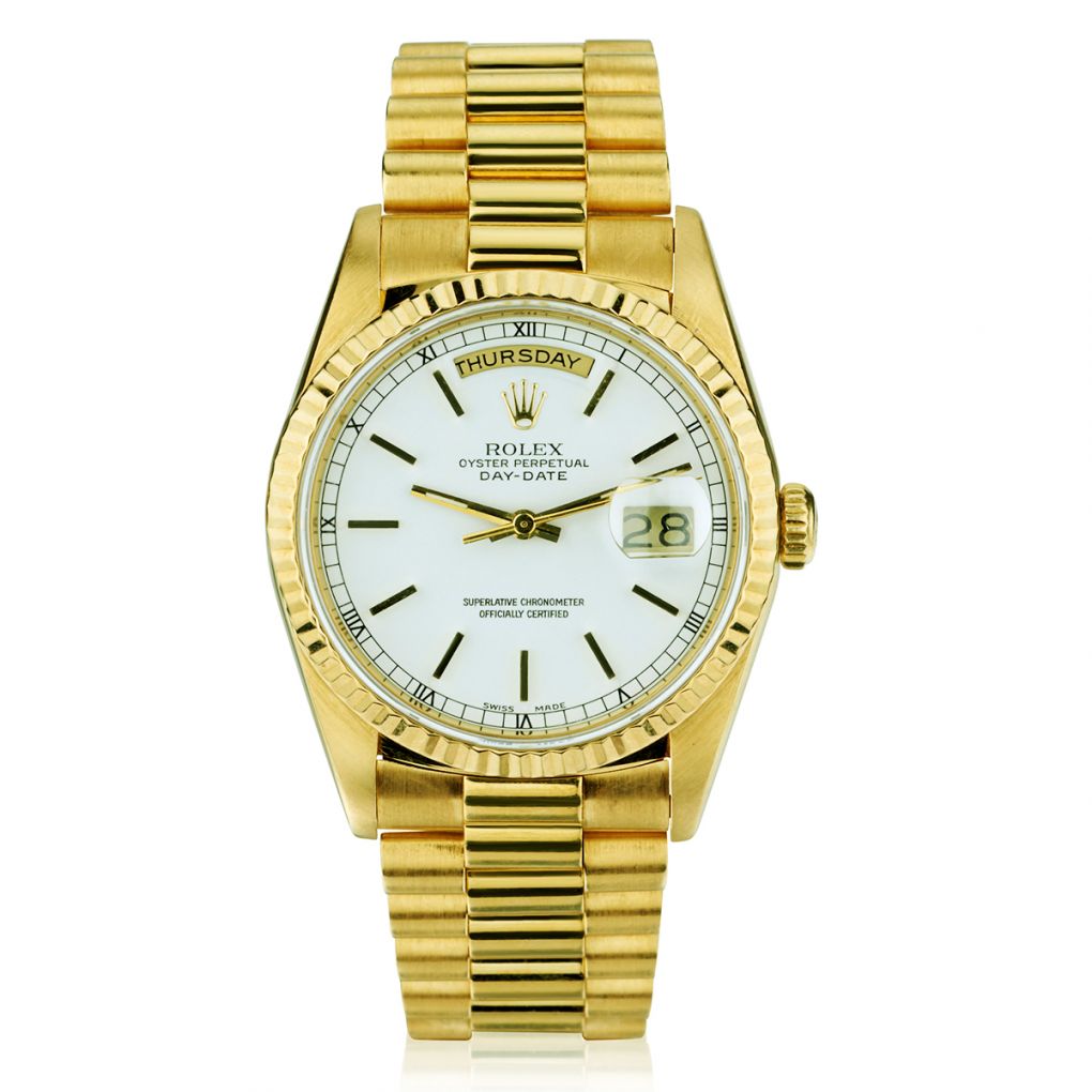 Rolex 18kt yellow gold Date-Date President . Integrated 18kt yellow gold presidential bracelet. 18kt yellow gold fluted bezel.36mm case size. White dial with gold stick markers. Double quick. Date /Weekday. Automatic movement. Caliber:3135. Sapphire crystal.