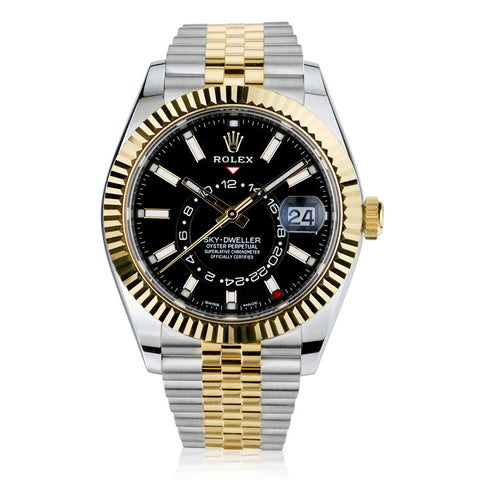 Rolex Skydweller in steel and 18kt yellow gold wristwatch. Integrated steel and 18kt yellow gold Jubilee bracelet with fold over clasp.. Black dial. Automatic movement. 42 mm case size. Water resistant:100m. Functions:Annual calendar,Date,GMT/World time. Circa 2022. Reference number: M326933-0005.