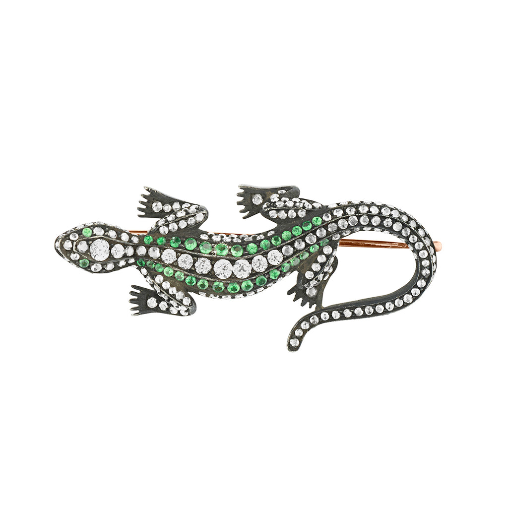 Vintage inspired whimsical diamond and green Tsavorite lizard brooch. This brooch is set with diamonds and green Tsavorite stones. This brooch measures: 44mm (L).