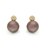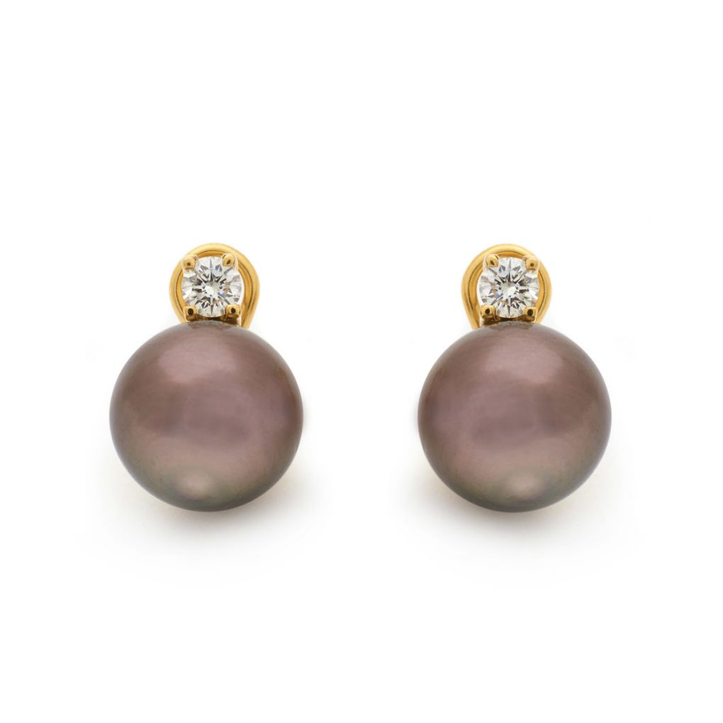 Ladies 18kt yellow gold pearl and diamond ear clips featuring two (2) round South Sea cultured pearls measuring approximately 14.0-14.5mm in diameter. The cultured pearls are dark grey to grey-green with pink overtones, lightly spotting, bright lustre and medium matching. The pearls are further enhanced by two (2) round brilliant cut diamonds weighing approximately 0.65 carat total weight of (SI1/SI2) in clarity and (G-H) in color. The ear clips have a high polish finish with post and omega fittings for pierced ears; Stamped “750” and weigh 15.94 grams.
